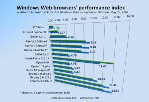 所有浏览器在 Windows 7 RC 上的运行速度均比Vista SP2更快,而且幅度很高:11.9%。 IE8 浏览器在Windows 7上运行比Vista快15%,Mozilla FireFox 3.5 Beta4速度快12%, Chrome 2和3 版本分别快16%和12%, Opera 10的运行速度快15%以上,然而唯一让人震惊的是...