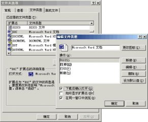 点击一个指向.doc类型的文件后,怎样不直接在IE里打开,而是弹出一个对话框提示用户想下载还是打开。解决方法很简单,打开我的电脑,在菜单里选择工具-文件夹选项,在对话框里选择文件类型这个属性页,在列表中选中扩展名为doc的类型,按下面的高...