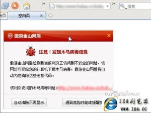 遨游(Maxthon)浏览器2.5.10着重强化了安全方面的功能,加入了网盾模块,其浏览器保护功能包含两部分,清除网页木马病毒和恶意网站提醒。 当用户不慎访问到一个带有木马的网站时,主动防御机制将发挥作用,快速弹出一个覆盖网页的提示(如图1所示),...