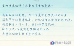 百度爱好者( Baiduer.com.cn )消息 近日, 百度浏览器 发布公告称为了使产品得到更好的发展,旗下福利平台将暂停服务。公告称,目前用户未能使用的电子码可以通过百度浏览器福利平台的贴吧联系工作人员找回,并继续使用。 福利平台是百度浏览器...