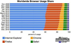 据美国互联网流量监测机制Net Application发布的最新数据统计得知,2010年12月,微软IE浏览器全球市场份额再次下滑,并继11月后再次创造历史最低值,而谷歌Chrome浏览器全球市场份额却攀升至历史最高值。 (图1)2010年12月全球主流浏览器市场份额...