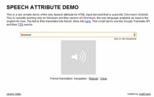 Chrome 7 的新功能之一就是语音输入,这项功能将对类似于 Google 语音搜索这样的应用非常有用,虽然目前该功能还没有正式完成,但已经颇具雏形,并且一名叫做 Jeremy Seiler 的开发者已经搞出了一个演示程序,就是使用 Google Translate API 将语...