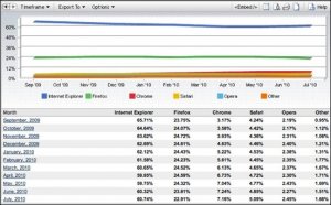 市场研究统计公司 Net Applications 公布了刚刚过去的2010年7月浏览器市场占有率报告,Google Chrome 在6月获得 7.24% 的占有率后在7月小幅回落至 7.16%。竞争对手方面微软 IE 继续上个月的升势,占有率达到了 60.74%,Firfox 从23.81% 大跌至 22....