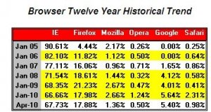 美国投资公司Janco最新统计的数据显示,2010年8月微软 IE浏览器市场份额为66.07%,较2009年8月下滑4.54个百分点。 来自网络监测机构Net Applications的数据则显示,2010年7月微软IE浏览器市场份额为60.74,并且IE份额在6月份还呈现出一种鲜有的上...