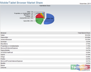 12月2日消息,国外数据分析机构Net Application 11月份的手机浏览器市场排行榜。手机浏览器Safari则据半壁江山。 市场占有率前三名为 Safari 、 Opera Mini 和Android Browser,所占市场份额分别为55.03%、20.09%和16.36%。 从今年整体趋势看,苹...
