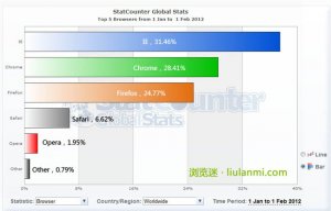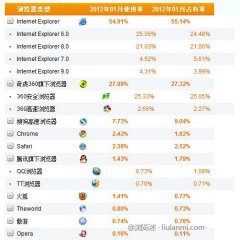 在2012年1月份的 浏览器排行榜 统计中,只有 Firefox 在两家的统计中都是处于下降的趋势。从NetMarketShare的统计来看, Chrome 也首次出现了下降,从2011年12月份的19.11%下降到了2012年1月份的 18.94%; IE浏览器 在2012年的第一个月份中市场份...
