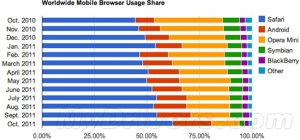 知名市场调研机构Net Applications日前公布了2011年10月份智能手机市场份额报告,在全球手机浏览器市场,苹果Safari以明显优势占据霸主地位,而Opera Mini也首次被Android浏览器超越。 数据显示,乘着iPhone的东风,苹果Safari手机浏览器在过去一...