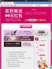QQ浏览器HD(iPad)2.0新版发布之际,联合精品购物B2C银泰网做签到送红包活动,活动时间内只要签到3次即可获得90元银泰红包一个,由于100%的中奖率吸引了大量iPad用户下载QQ浏览器HD(iPad),并签到抢红包。 分析认为,QQ浏览器HD与银泰的合作起到了...