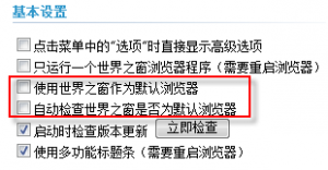 点击菜单栏工具按钮默认浏览器,即可设置默认浏览器。 如果你使用的操作系统是Vista,可能会弹出用户帐户控制对话框,选择允许即可。 进入 更多选项常规,可也对默认浏览器进行设置。 如果使用中发现世界之窗无法对某些程序的调用进行接管,可能是别的程序修...